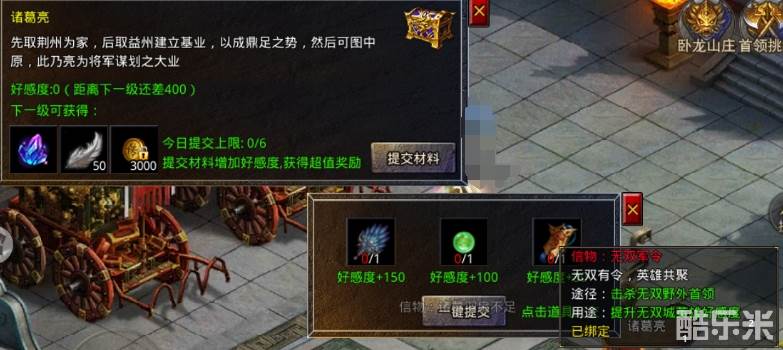 击杀无双城野外怪物以及首领通常会获得一些特殊的NPC材料,这些材料可以前往地图中:刘备、诸葛亮、周瑜、小乔、夏侯惇、司马懿、无双城主这些NPC处赠送获取好感度,可获得丰富的奖励。