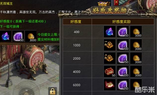 奖励可以在NPC处预览、不同阶段的好感度赠送的奖励不同,最高奖励档次为6000好感度。