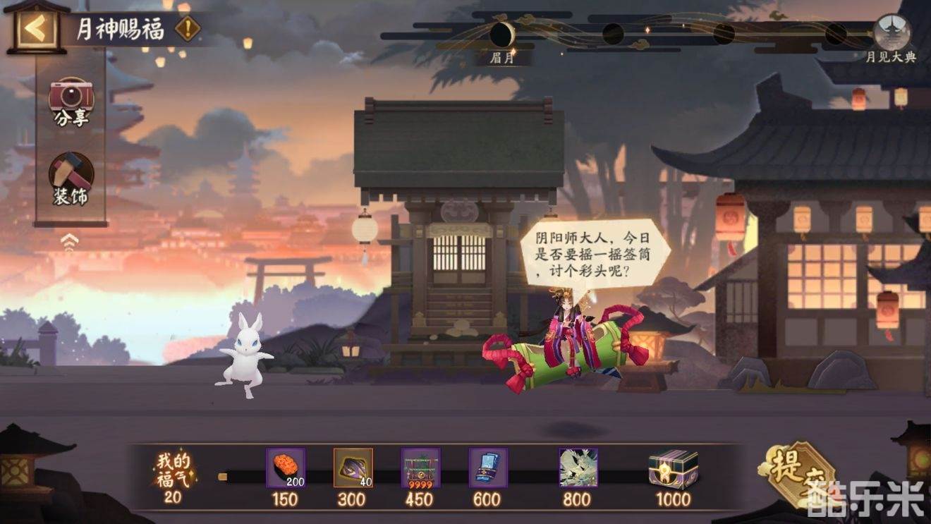 ※本次活动分为四个部分,包括水中探月、月神赐福、蹭福气、月见大典,大人们可点击庭院中的地藏像或右侧小纸人图标进入活动;
