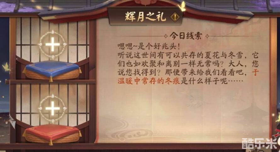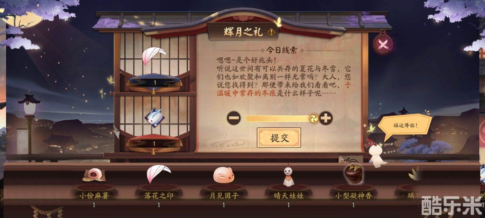 阴阳师月夕织梦月神赐福第一天答案是什么?中秋还有2天就到来了,这次阴阳师中秋活动中有一个辉月之礼的玩法,是需要玩家根据线索来猜测每天供奉物是什么,今天是活动第一天,线索是于温暖中常存的冬痕是什么样子呢,小编为大家带来今天的答案!一起来看看哦。
