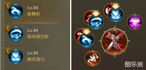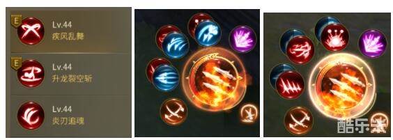 连续技:连续技标识为红色,玩家发动攻击、受到攻击都能积攒怒气值,怒气值提升至上限则会进入斗志状态,斗志状态下,使用主动技后10秒内能使用连续技。每把武器可以装备三个连续技,每个职业可以装备六个连续技。