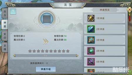 1.宝物系统分为血玉,神盾,官职,龙魂四项系统。四系统消耗各自资源升级,最高12阶,每阶10星。