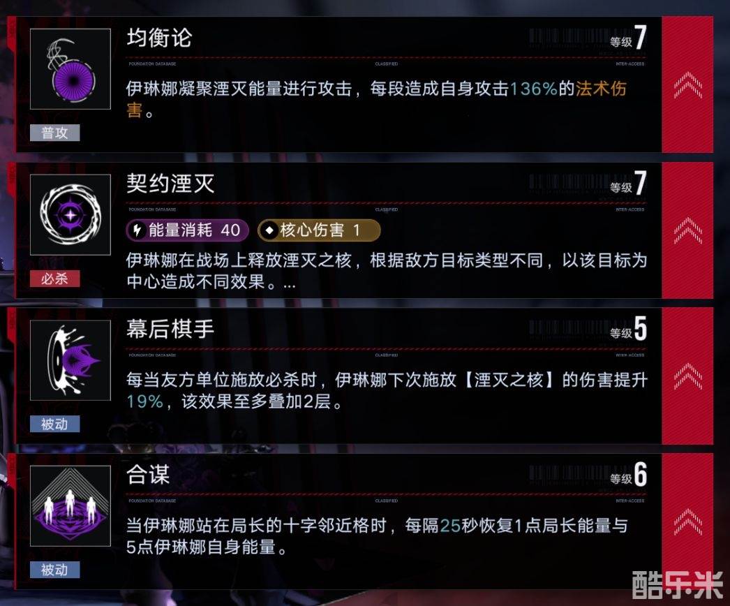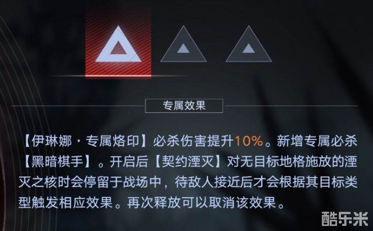 队友释放技能后可以提升伊琳娜大招的伤害,最多提升3层(1枷锁),所以在部分需要追求极限伤害的副本中,可以利用操作来一定程度上提升伊琳娜大招的爆发力最后可以同时回复局长与自身能量的效果也是伊琳娜被大家称为充电宝的最大原因,且这个效果的实战反馈那真可谓是神技一般的存在