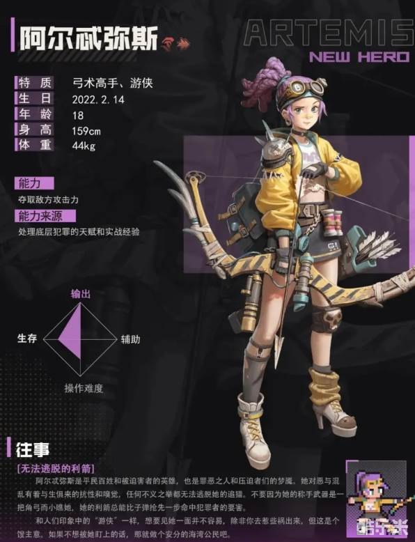 专属技能(需要英雄进化才解锁):每有一个标记英雄死亡,阿尔忒弥斯 自身会生成一个圣盾,增加最大生命值并且恢复对应生命值英雄属性:主要是以输出为主,其次才是生存能力