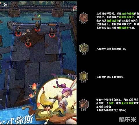 主动技能:在主动回合开始时,会标记攻击力最高的敌方英雄,若该英雄在我方回合死亡,则永久将其当前攻击力的百分之四十多(会随着英雄的等级而升级)转移到阿尔忒弥斯自身上,若是阿尔忒弥斯死亡,则将其所有攻击力随机转移给敌方英雄