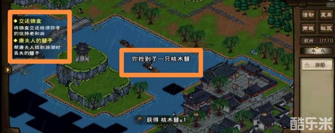 1.烟雨江湖隐藏任务最多的是杭州:第一个是‘’桃木簪‘’:(17.11)轻功水上漂上船搜索。(不确定水上漂行不行,玩家用的一苇渡江也可以),在湖面上找到唐夫人丢失的桃花簪。