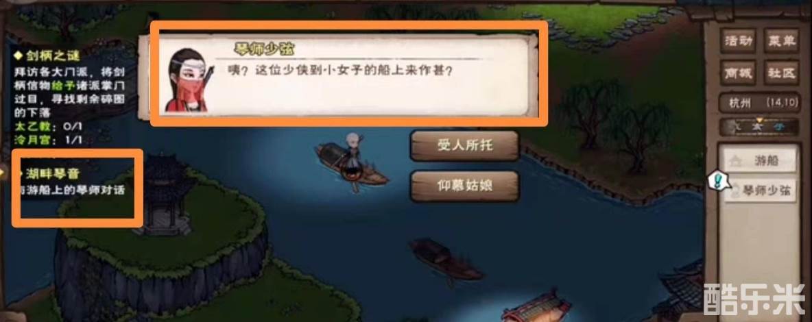 3.第三个隐藏任务是‘’琴师‘’:玩家需要去楼外楼打听琴师,亥时去苏堤(据说亥时,但有时一次不能触发,建议快到亥时就去),由(8,18)上苏堤,在苏堤上走一遍,若触发,则会在(10.12)出叹号,没有则未触发,可回(8.18)再走几次,一般三四次就触发了。轻功上船(14.10),与琴女对话,选仰慕,天亮后去苏堤上找书生复命。