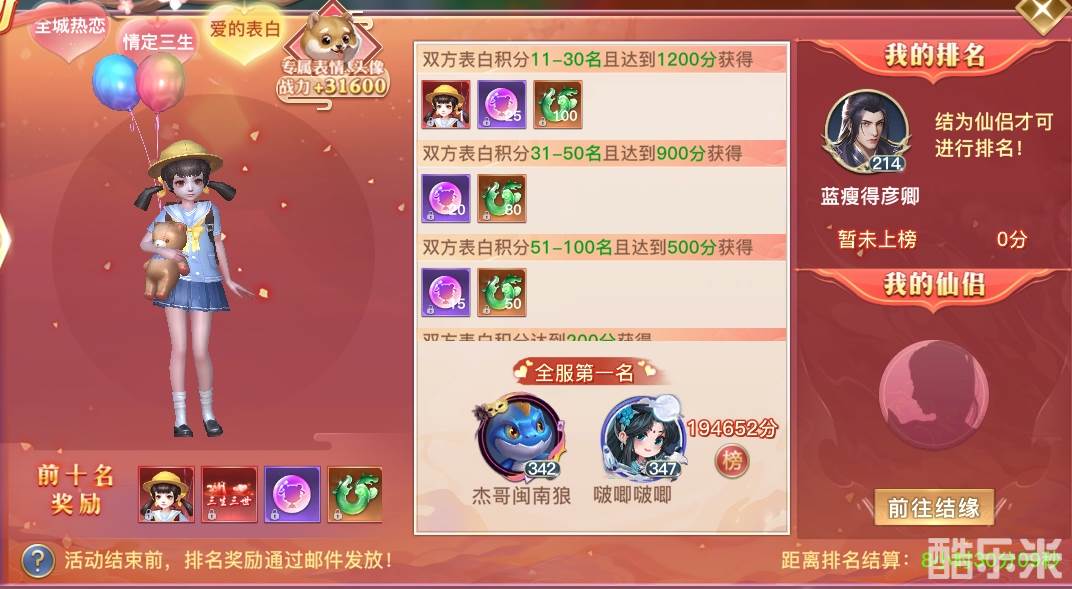 2、 仙侣双方的表白积分总和满足条件可获得排名奖励