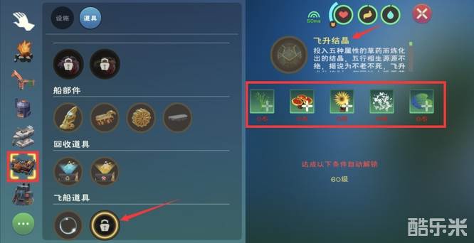2、然后在工具栏中找到道具,制作飞升结晶需要用到奇竹木,灵火芝,涌土花,幻金簇,漪水萍五种材料,准备好即可制作(需要60级解锁)。