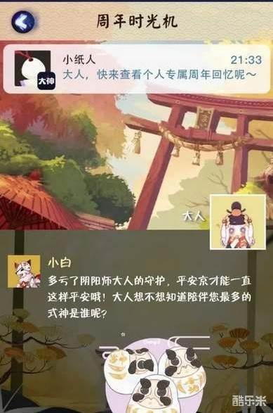 3.时光机会带玩家们回顾过去一年在平安京的经历与收获,分享个人数据有机会获得随机SSR/SP、周年庆纪念头像框及周年限定皮肤,感兴趣的小伙伴赶快去尝试一下吧。