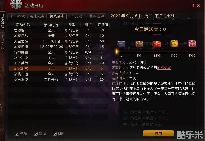 “离火地宫”是《山海神迹》中副本之一,全天开放,一天只能进入一次。相对来说比其他副本难度高点,角色等级需要45级,最少组三个小伙伴才能进入副本,“离火地宫”副本有分普通型和困难型的。当小伙伴们选择后进入“离火地宫”我们首先找到NPC酒酒,需要她帮我们打开缘生之门才可以进入主题。