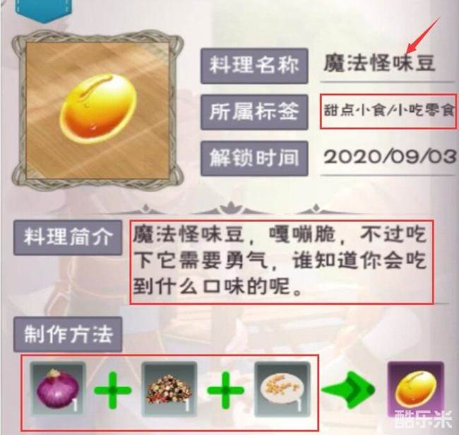 1、在游戏中魔法怪味豆需要通过烹饪锅中制作,由黄豆、洋葱、胡椒制作而成,是一种甜点小食,它拥有多种效果加成。