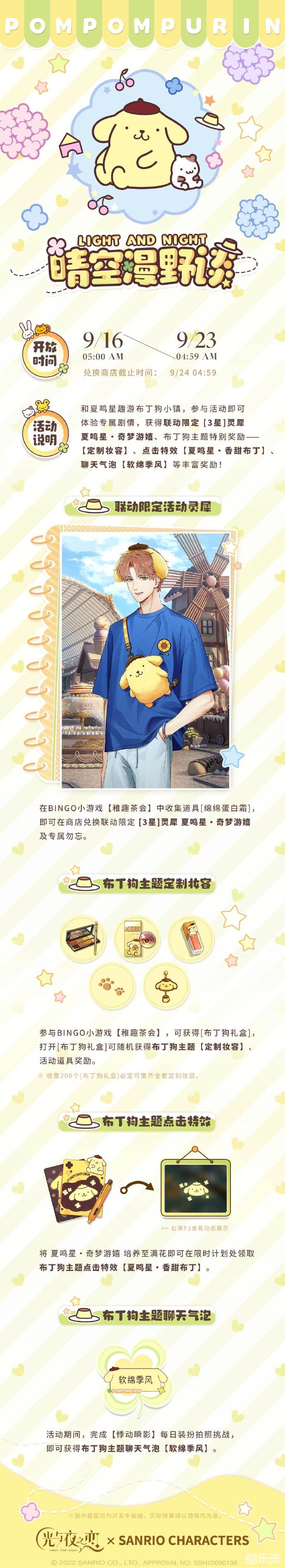 活动说明:和夏鸣星趣游布丁狗小镇,参与活动即可体验专属剧情,获得联动限定 [3星]灵犀 夏鸣星・奇梦游嬉、布丁狗主题特别奖励——定制妆容、点击特效【夏鸣星・香甜布丁】、聊天气泡【软绵季风】等丰富奖励!