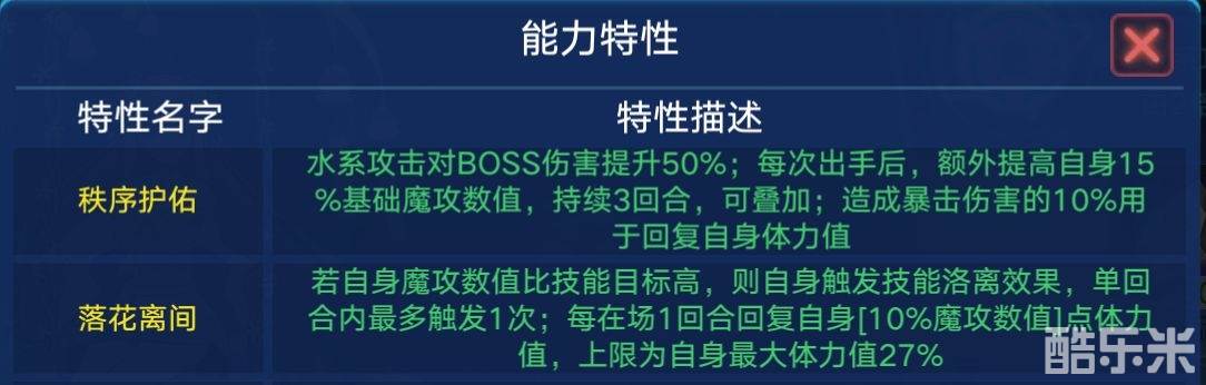 ⑵能力特性:pve一般是带落花离间(除非对面魔攻太低,复制不了多少-不过boss双攻一般不会太低。或者是对面双攻太高复制不了)