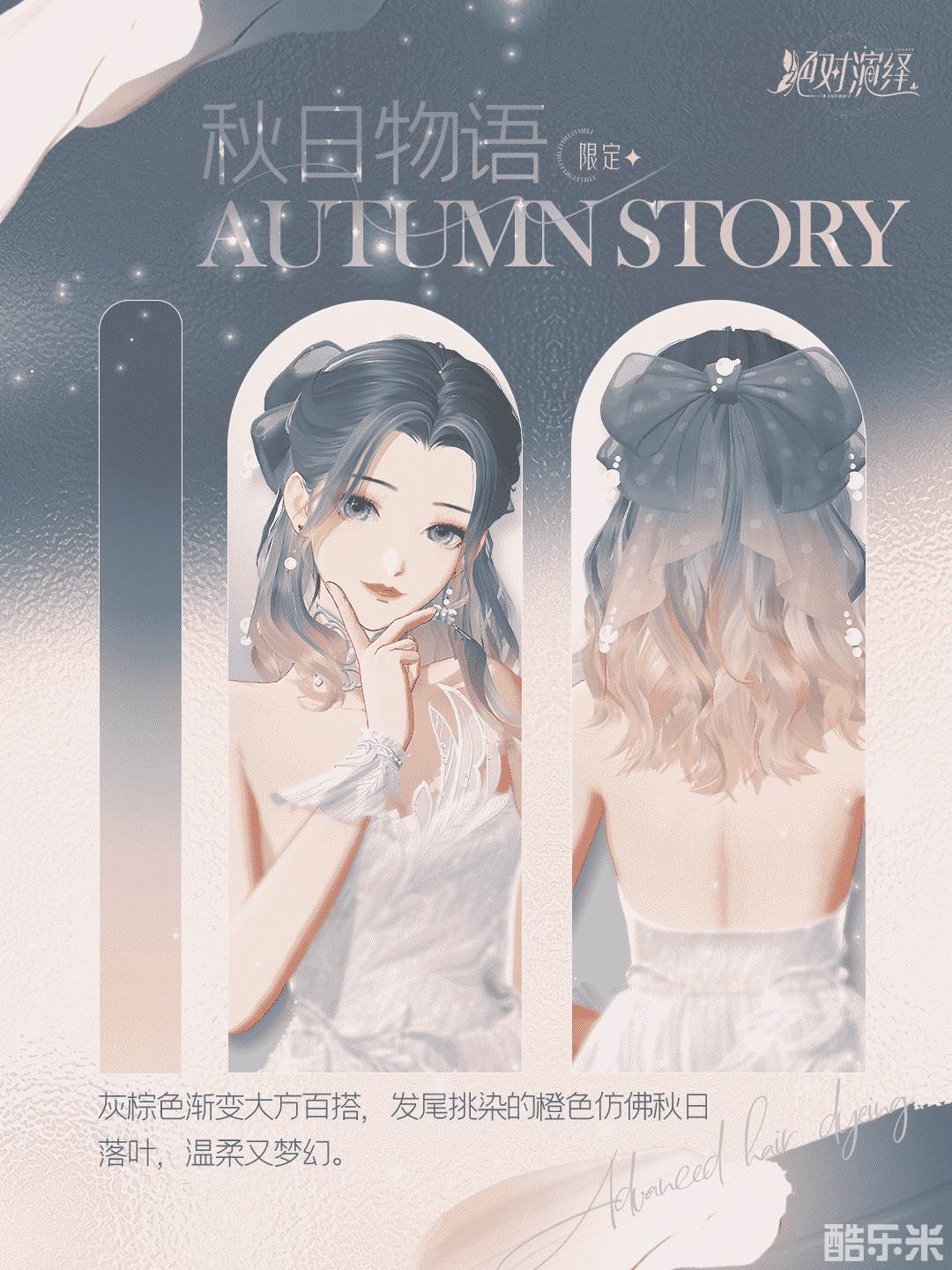 想要低调又优雅的玩家可以选择秋日物语!雾蒙蒙的灰色温柔质感显高级,如同一潭沉静的湖水,使人感到亲切与舒服。发尾挑染的枫叶橙叛逆俏皮,像是一片枫叶悄然落入湖水中央,荡起一阵阵涟漪。这么优雅的发色怎么能不心动啊?