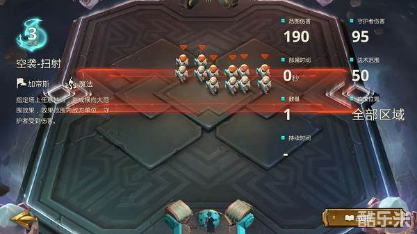 描述:指定场上任意地点,造成横向大范围效果,效果范围内敌方单位、守护者受到伤害。