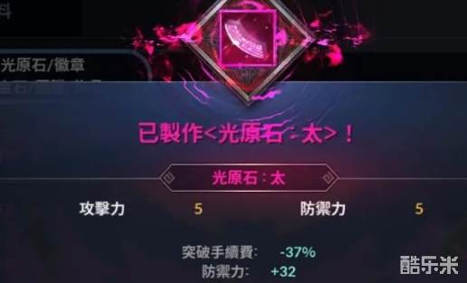 强化之后就能看见光原石的品级有了提高,光原石的属性也会增强。游戏目前只可以相同颜色和相同部位的光原石进行强化,其他光原石是不支持强化的。