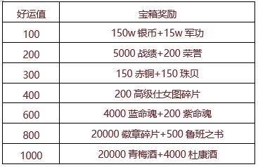 【活动内容】活动期间,每消费1000金币,即可获得100好运值,累计获得好运值可开启奖励宝箱。