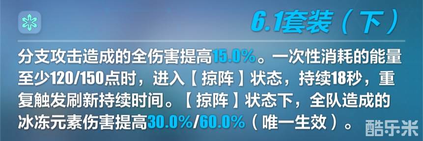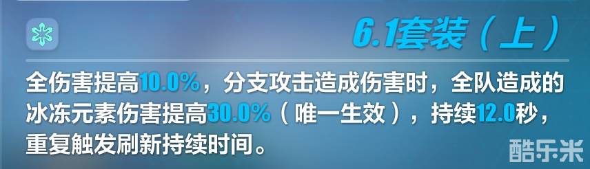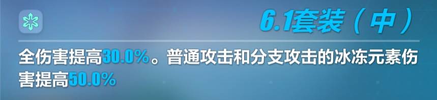 无条件的全伤提升,且使用分支攻击后还可以提升全队冰伤。满启动后数值尚可,作为单件来讲无疑是比较优秀的,但受限于有分支攻击的角色。