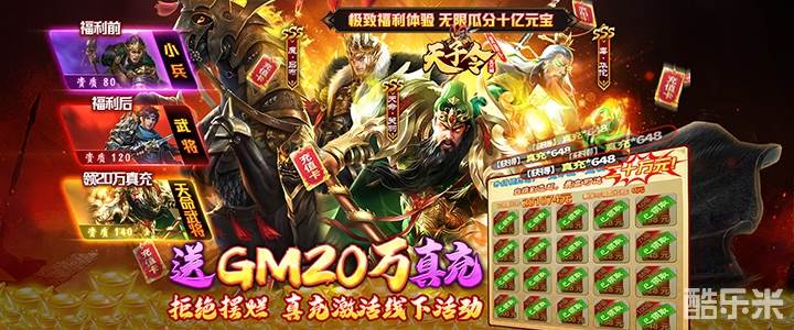 2.上线即送200万元宝,1亿铜钱,GM资源包,免费解锁GM1,登录签到免费领取海量道具,5星超强战神关羽,1000GM币,百连抽,领到最后应有尽有!