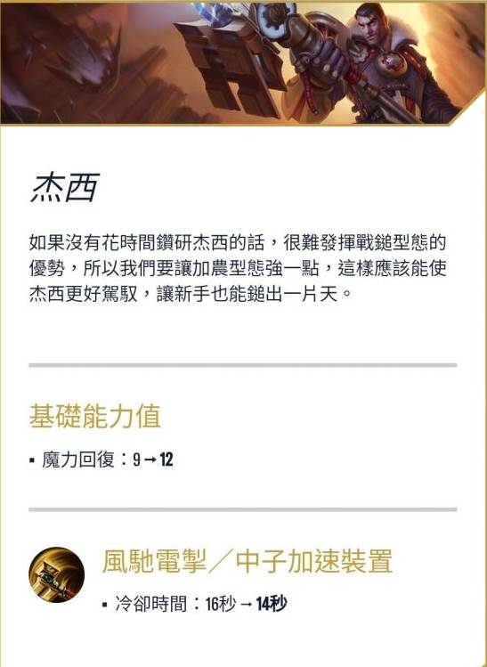 使用杰斯不够熟练的玩家往往无法充分利用他的大锤形态,因此我们准备进行一些调整,让他更容易保持大炮形态。这样一来,杰斯的使用难度曲线应该会变得更加平缓,让他更轻松地消灭敌人。