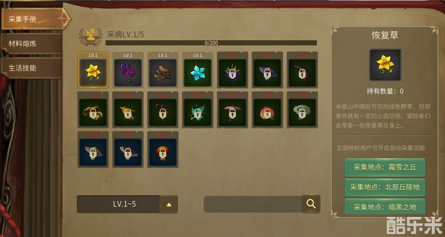 在采集手册里,你可以看到各种材料的介绍、所在地以及采集它需要的职业等级。