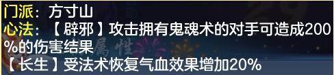 方寸的门派心法相对来说也是十分实用的,对于常规加点的方寸(一速或辅助封)辟邪基本上作用不大,是对于非主流的加点的方寸——魔方寸来说,辟邪就十分强大了,大幅度增加对鬼魂单位的伤害。在PK当中十分好用。而长生的作用比较明显。受法术恢复气血时效果会增强,包括特技,复活。所受到的治疗量都会增高。