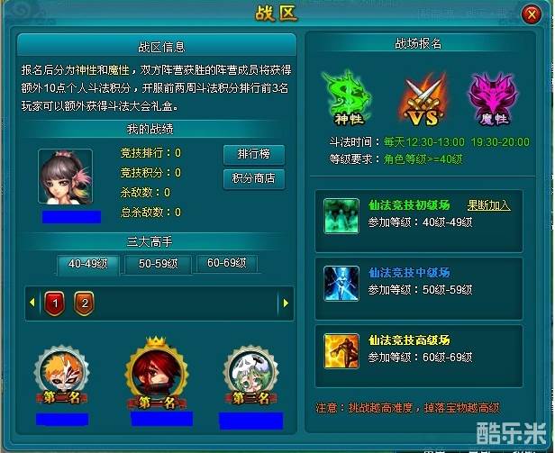 1.所有40级-49级的仙友在每天的12:30-13:00,19:30-20:00可报名参加竞技场战斗。