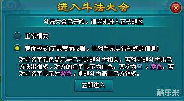 1.玩家进入竞技场可以选择模式:1.正常模式(按照玩家原来的形象进入,在准备区域玩家可以查看您的信息) 2.蒙面模式(穿戴蒙面服装,让其他玩家无法知悉您的信息)如下图:
