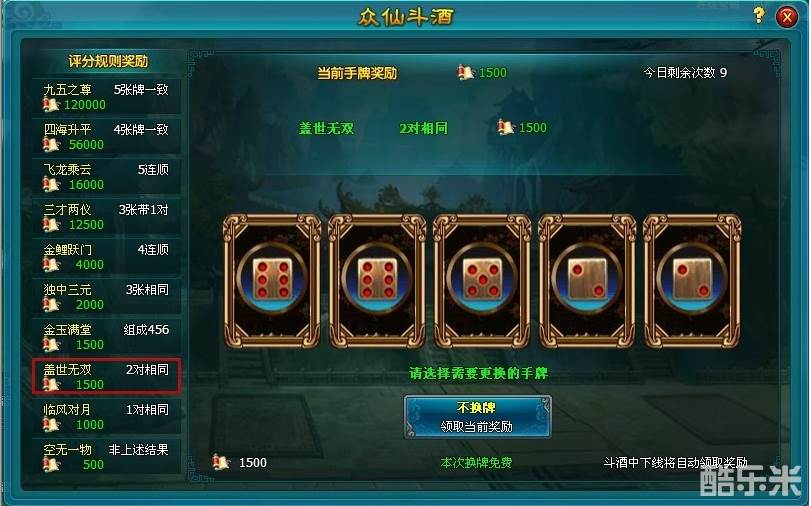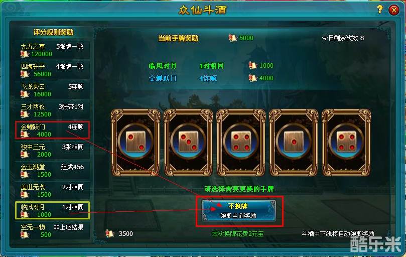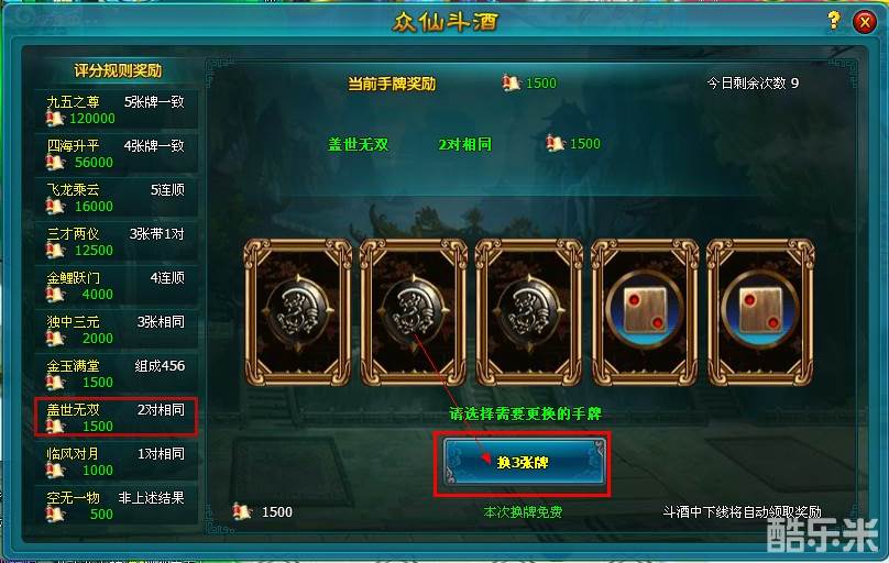 4.每次游戏,仙友都有两次免费换牌机会,之后更换需要消耗元宝