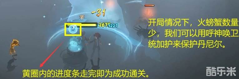 战斗开始后会不停的刷新出火螃蟹朝丹尼尔攻击,这些火螃蟹是会移动的,所以我们需要用魔咒来保护丹尼尔的安全。