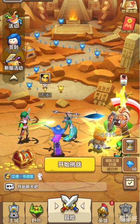 当玩家成功通关嚎叫洞穴2-8就会开启野外地图,在这里可以白嫖到的资源多到无法想象,玩家可以通过派遣英雄取完成悬赏任务,任务共有5个档位,由高到低分别为:粉、橙、紫、蓝、绿,根据颜色不同完成的时间不同,奖励也不同,建议优先高级任务完成。另外通过解锁更多地图,也会开启不同的小游戏,获得更多资源奖励!
