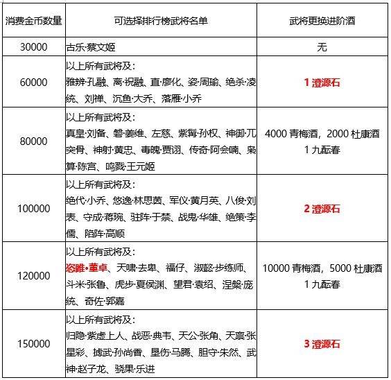 1、活动期间,累计消费金币数量达到对应金额,可以联系在线客服申请1个排行榜武将奖励,或对应金额的进阶酒或澄源石奖励;