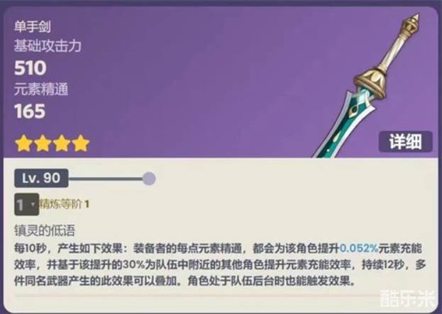 每10秒,产生如下效果:装备者的每点元素精通,都会为该角色提升0.052%元素充能效率,并基于该提升的30%为队伍中附近的其他角色提升元素充能效率,持续12秒,多件同名武器产生的此效果可以叠加。角色处于队伍后台时也能触发效果。