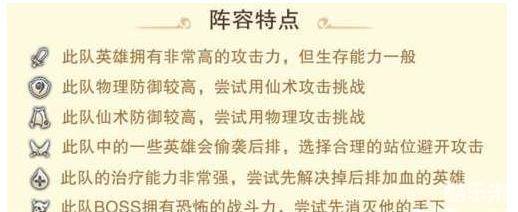 在画面中上方,会有此关敌方阵容特点。前期也许不明显,但到了后期,针对不同阵容,我方必须选择不同英雄搭配去针对,才能达到事半功倍的效果。