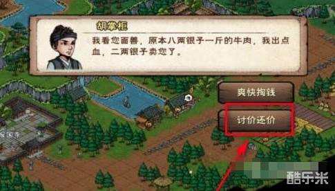 3、这时胡掌柜会提出需要2两银子才能购买到酱牛肉,选择【讨价还价】选项。