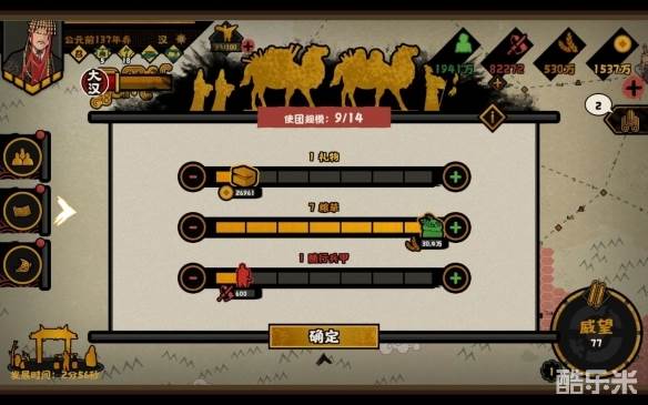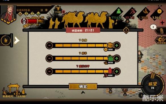 补充:使团规模由关卡等级、关卡数量决定,最多可以拥有四个关卡,在西域附近可以找到