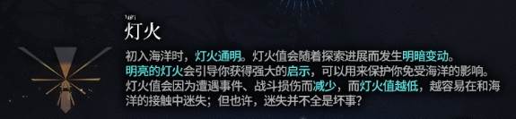 明亮的灯火会引导你获得强大的启示,可以用来保护你免受海洋的影响。灯火值会因为遭遇事件、战斗损伤而减少,而灯火值越低,越容易在和海洋的接触中迷失;但也许,迷失并不全是坏事?