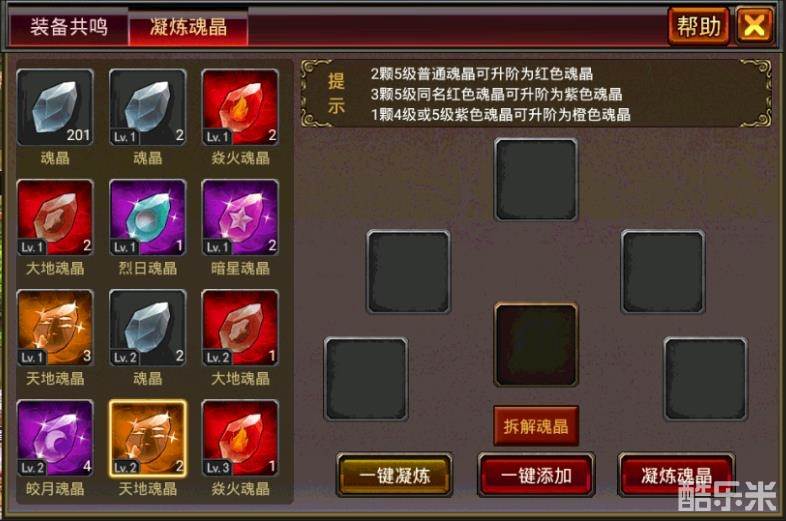 ·凝炼魂晶界面,选中1级以上天地魂晶时,会显示【拆解魂晶】按钮,可将所选天地魂晶拆解为5颗低一级的天地魂晶。