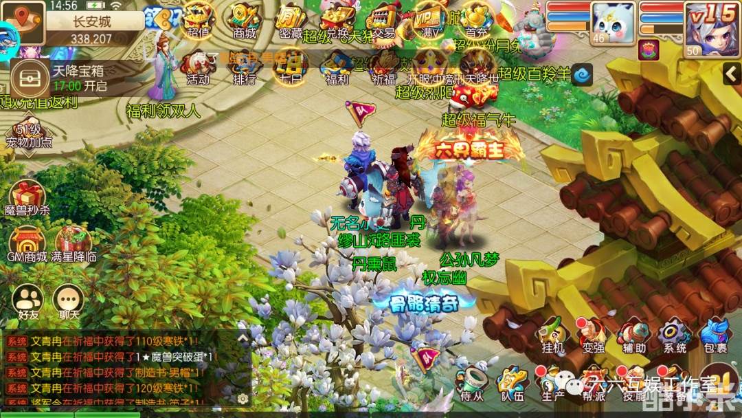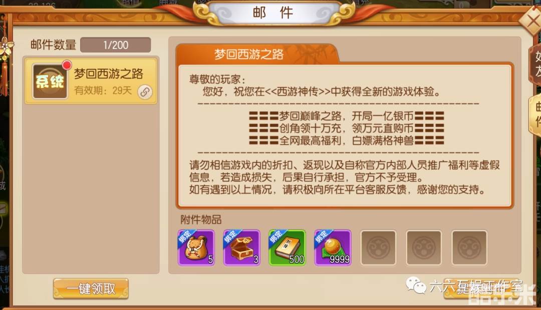 进游大礼包:首冲(进游直接激活,右上角直接领)+解锁背包*5+解锁仓库*3+宠物秘籍自选*500+还原丹*9999(邮件获取)