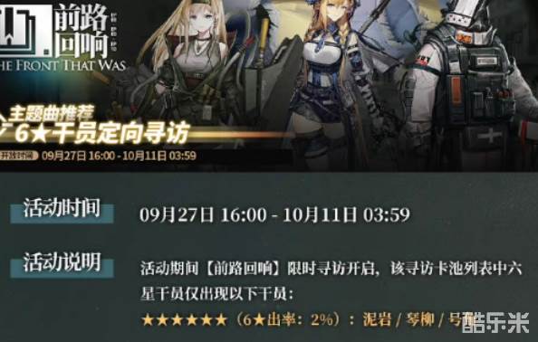 活动说明:活动期间【前路回响】限时寻访开启,该寻访卡池列表中六星干员仅出现以下干员: