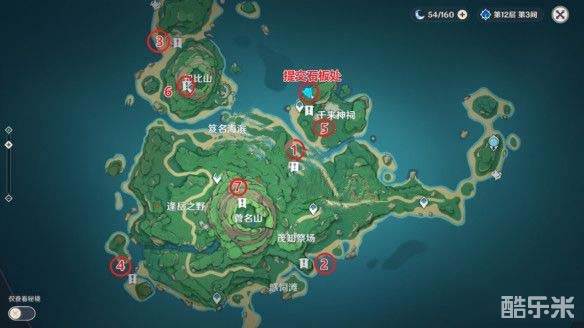 玩家需要完成雾海纪行任务,直接从最近的千来神祠传送点前往最底部的遗迹。这是最快到七块石板提交地点的,同时在图中标出相应的位置信息。