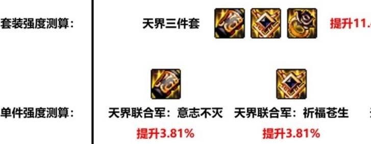 单件强度测算为角色无融合史诗视角下,增加一件融合史诗带来的提升。由于攻强的稀释特点,与套装提升率的关系并非单纯相加或相乘。该属性主要用于单件之间横向对比强度。