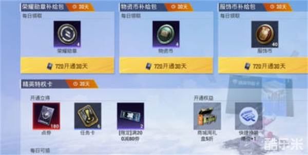 5:补给包商城开启,我们在开通精英特权卡之后,可以继续购买四个补给包,默认是三十天,有荣耀勋章,物资币,服饰币等等;