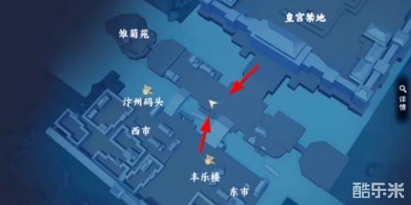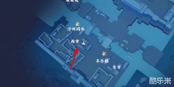 3、之后我们需要前往西市下图位置,找到小吃摊老板并与之对话。