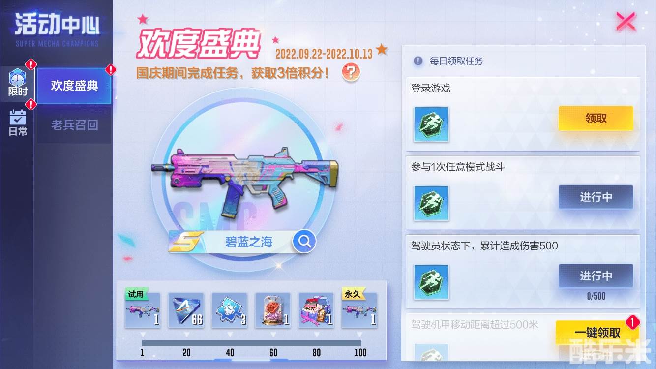 完成任务累计盛典积分领取皮肤“战术冲锋枪-碧蓝之海”等丰厚奖励!国庆期间(10.1-10.7)完成任务可获得3倍盛典积分!