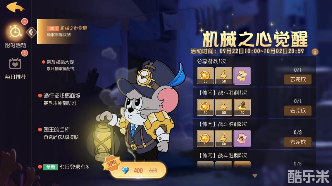 回到猫鼠追逐舞台,蒙金奇指挥官为小伙伴们下达了新的指令。9月22日至10月2日,参与限时“机械之心觉醒”活动完成任务,就能获得包括金币、知识点、星星、扫货币、活跃度、邮票、通用皮肤碎片、通用角色碎片、蒙金奇体验卡、机械之心头像在内的丰富奖励。小伙伴们快快打开游戏,一同完成任务吧!