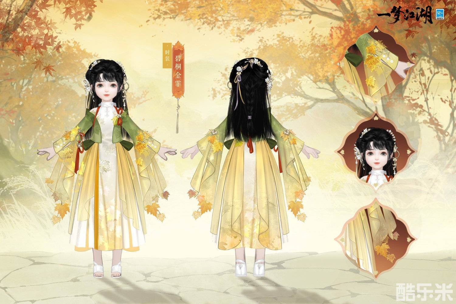 一梦江湖全新时装·碧桐金霏以最能代表秋季的金色与梧桐树间的碧色为主色调,整套时装采用双色交融渐变的设计,仿若初秋的阳光散落在梧桐树金黄与碧绿相间的枝头。时装·碧桐金霏以梧桐叶与枝干为元素制成精美装饰,在白色内衬之间缀满精致的花纹刺绣,并以浅金丝线点缀,给人以浓浓的秋日氛围感。