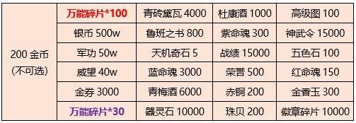 2、冠军可以从以上列出各项资源中,任选4项(不可重复),与200金币一同组成本届恩赐大礼包;