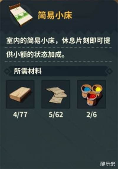 1:一级床,简易小床,麻布,材料是模板,麻布还有染料这几个,具体的数量是,77木板,62麻布,6染料;